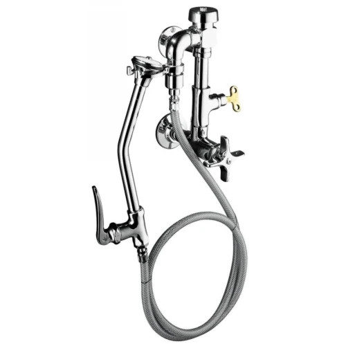 This bedpan washer features a wall-mount hose with standard sprayhead, exposed single valve, self-closing, lever-control spray and hook, loose-key stop, vacuum breaker and vinyl hose.