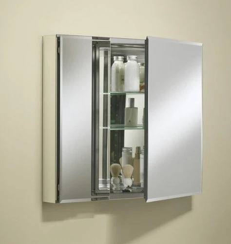 - Double door 30″ x 26″ aluminum cabinet with square mirrored door