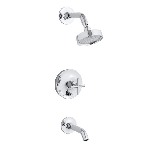 Purist faucets and accessories combine simple, architectural forms with sensual design lines. Featuring this modern, minimalist style, the Purist bath and shower faucet trim creates a sophisticated, unified look in your shower with a cross handle, spout, and showerhead. Pair this trim with a Rite-Temp pressure-balancing valve with push-button diverter, which maintains your desired water temperature during pressure fluctuations.