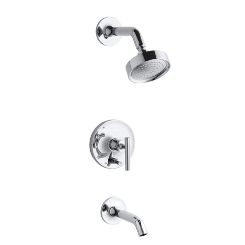 Purist faucets and accessories combine simple, architectural forms with sensual design lines. Featuring this modern, minimalist style, the Purist bath and shower faucet trim creates a sophisticated, unified look in your shower with a lever handle, spout, and showerhead. Pair this trim with a Rite-Temp pressure-balancing valve with push-button diverter, which maintains your desired water temperature during pressure fluctuations.