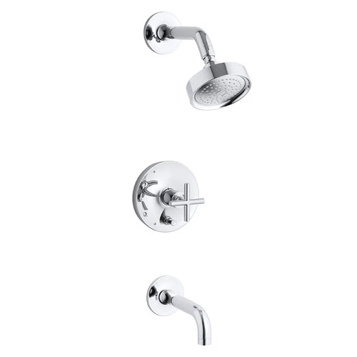 Purist faucets and accessories combine simple, architectural forms with sensual design lines. Featuring this modern, minimalist style, the Purist bath and shower faucet trim creates a sophisticated, unified look in your shower with a cross handle, spout, and showerhead. Pair this trim with a Rite-Temp pressure-balancing valve with push-button diverter, which maintains your desired water temperature during pressure fluctuations.